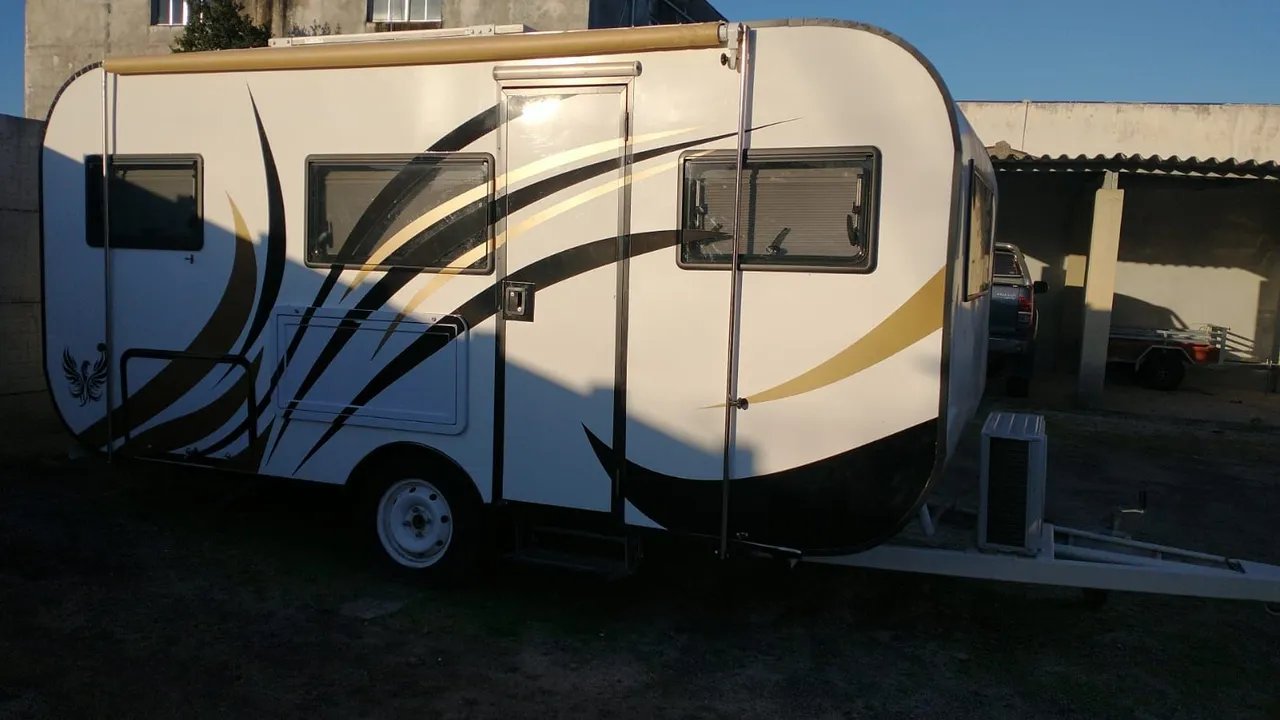 Treiler para 4 pessoas, ideal para viagens e acampamentos. Possui design moderno e confortável.