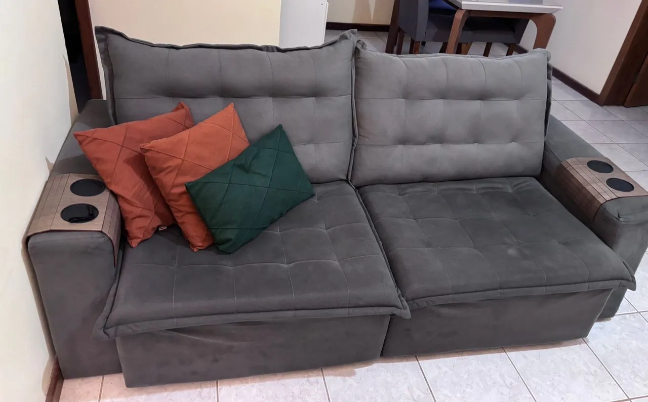 Sofá confortável e espaçoso. Retrátil. Tecido em bom estado(exceto os detalhes da foto). No braço esquerdo ele tem uma parte da madeira interna quebrada, mas não afeta na funcionalidade do sofa.