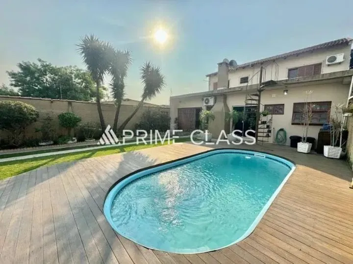 Sobrado amplo com 350 m² privativos, 03 quartos sendo 1 suíte na casa principal, laje nos dois pavimentos, rebaixe em gesso, peças amplas e arejadas, aberturas nobres, 2 salas de estar, sala de jantar, cozinha montada, lavanderia separada, piso superior dormitórios, banheiros e 1 sala com sacada podendo transformar em mais um dormitório, casa dos fundos com 2 quartos e 1 banheiro, sala de estar e jantar, lavanderia e pátio nos fundos, um pátio amplo de 11 x 44 com piscina, casa contem placas solares, ficam os móveis fixos, luminárias, garagem fechada pra 3 veículos.