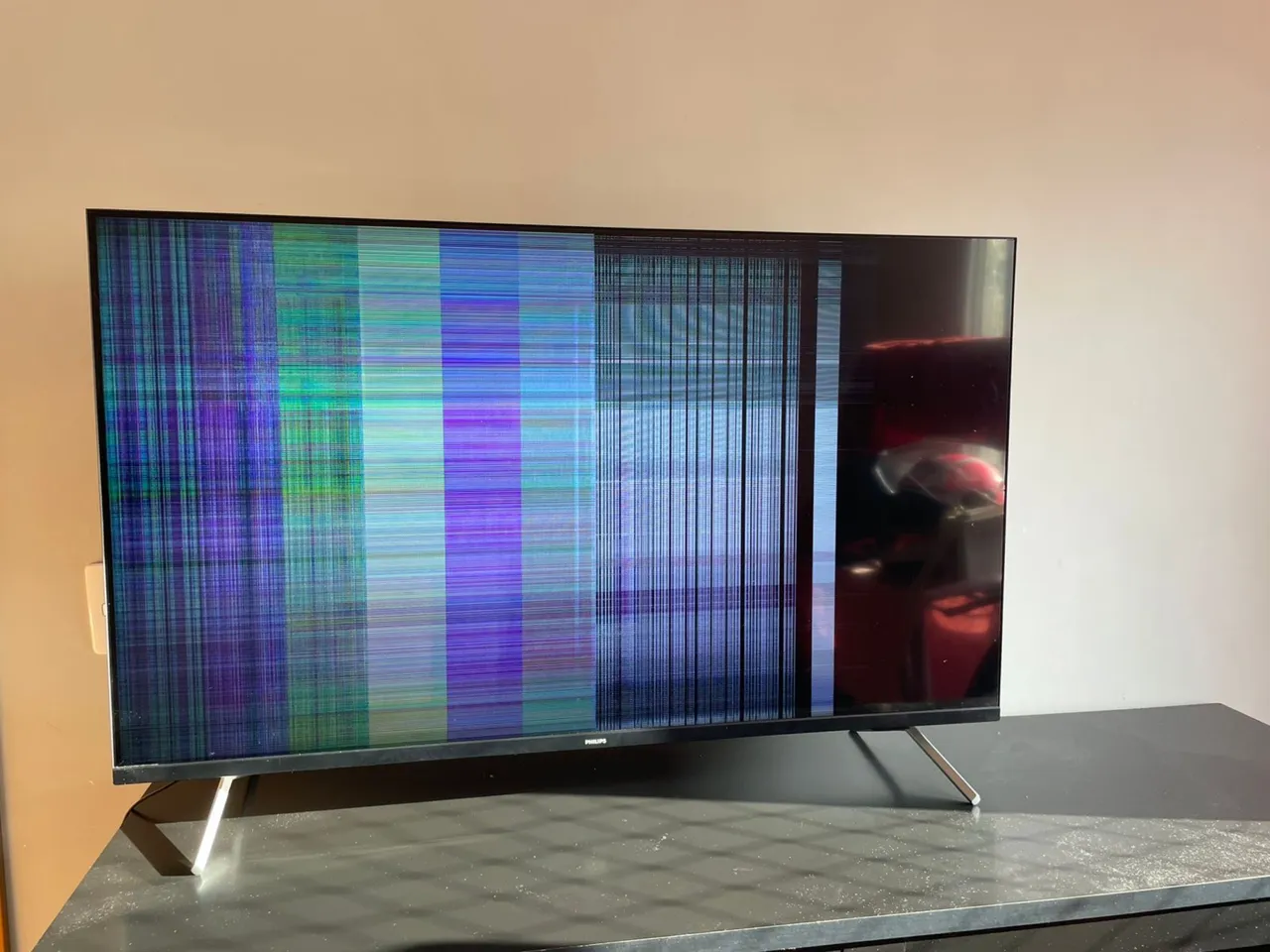 Smart TV Philips de 50 polegadas com tela danificada, ideal para quem busca peças ou conserto. Apresenta listras, mas ainda pode ser útil para reaproveitamento de componentes.